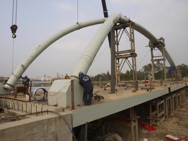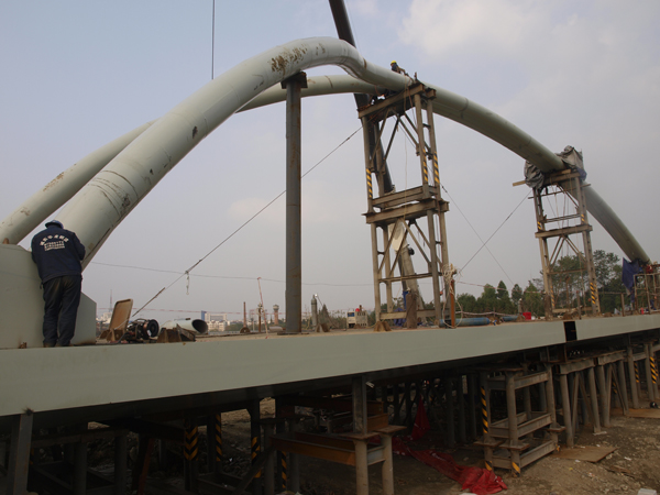 江油昌明河下游綜合整治項(xiàng)目明月橋?yàn)楫愋怨袄咪撓淞簶颍摴こ涛挥诮褪刑芥?zhèn),整個鋼箱梁及拱肋鋼結(jié)構(gòu)專業(yè)的工程量約為470噸,其中鋼箱梁跨度為72.6米,寬度11米。