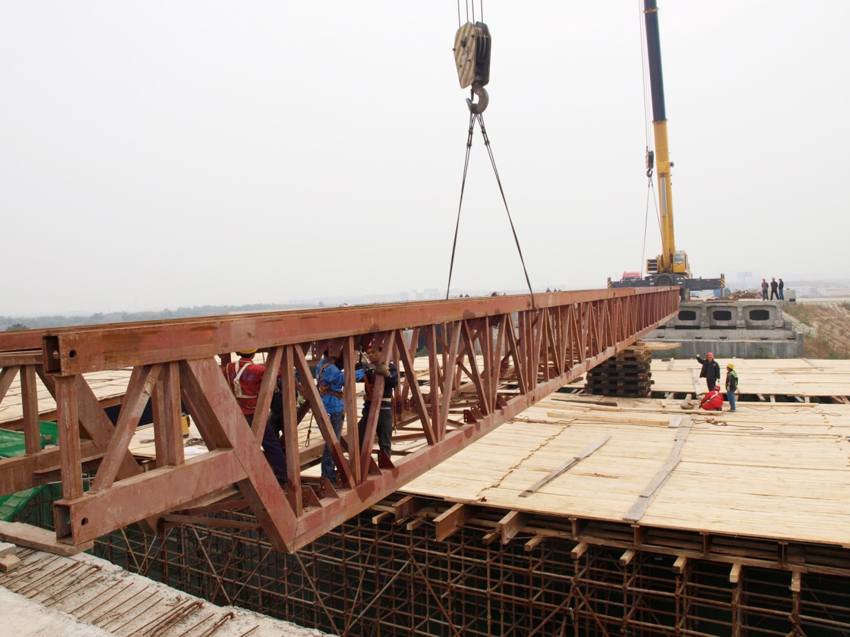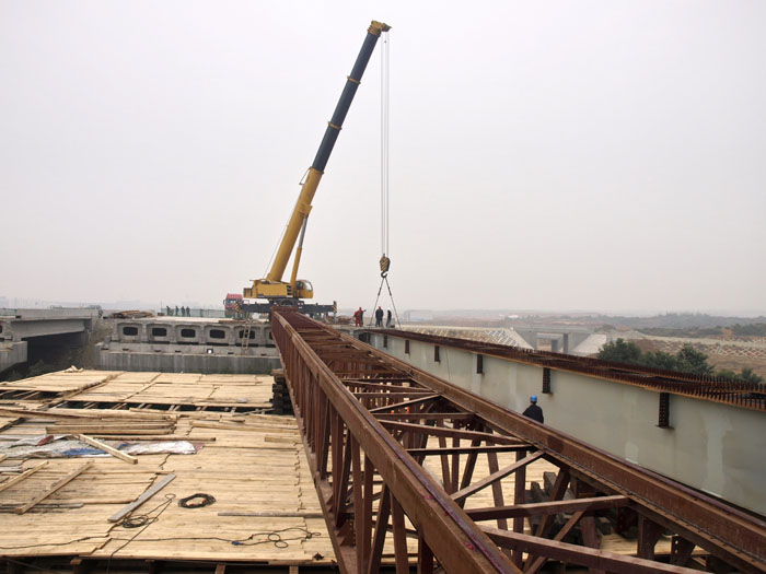 跨越成雅高速公路的成都雙華路(牧華路)遷建成雅互通52米跨度鋼箱橋梁,該工程位于成都雙流縣有著“千年麻羊鄉(xiāng)、現(xiàn)代工業(yè)鎮(zhèn)”的黃甲鎮(zhèn)。此工程鋼結(jié)構(gòu)專業(yè)工程量達(dá)到2000多噸。其中鋼箱梁跨度52米,寬度5.4米,高度2.4米,單個(gè)構(gòu)件重量達(dá)162噸。